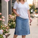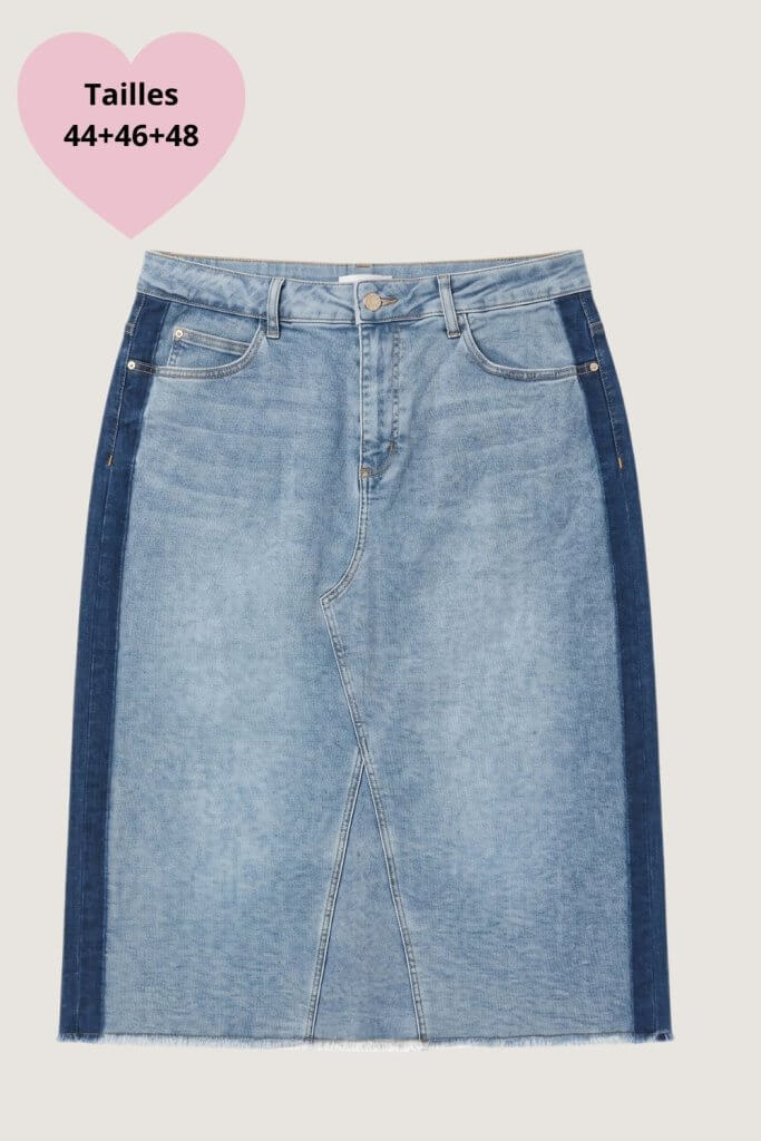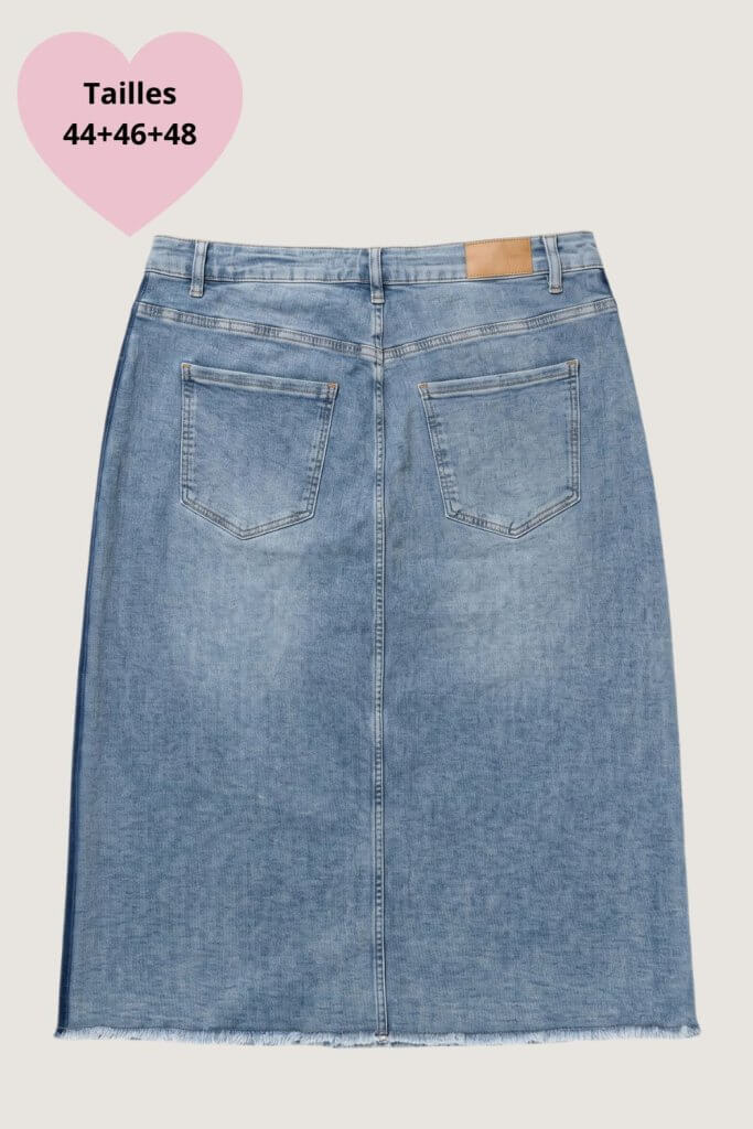 La jupe Jasmin, c’est la jupe en jean revisitée qu’on attendait — son effet bicolore bleu clair et bleu foncé sur les côtés est malin et affinant, il crée une ligne verticale qui allonge visuellement la silhouette. Sa coupe droite légèrement trapèze et sa touche d’élasthanne apportent ce confort qu’on aime au quotidien sans sacrifier le style. Signée Yest Curve, pensée pour les tailles 44 et plus.