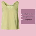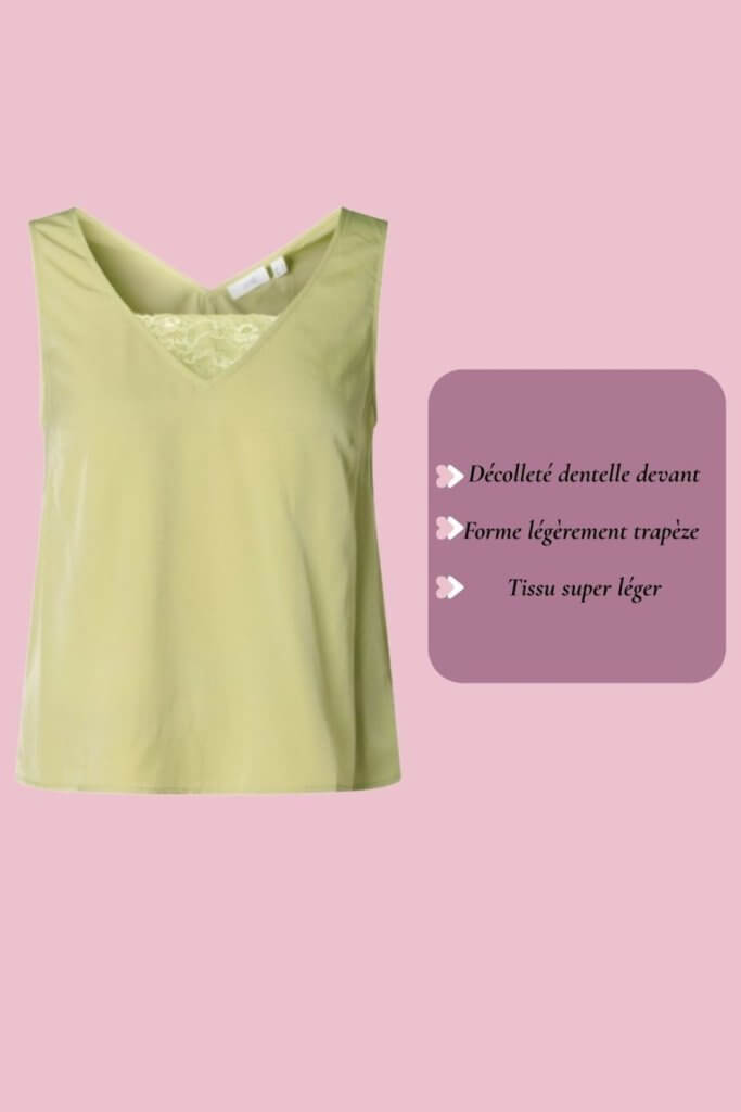 Le top Juliane, c’est la pièce douce et féminine qu’on enfile avec plaisir dès que les beaux jours arrivent. Son vert tilleul lumineux apporte instantanément de la clarté au teint et sa délicate bordure dentelle au col en V féminise le décolleté avec subtilité. Signée Yest Curve, pensée pour les tailles 44 et plus.